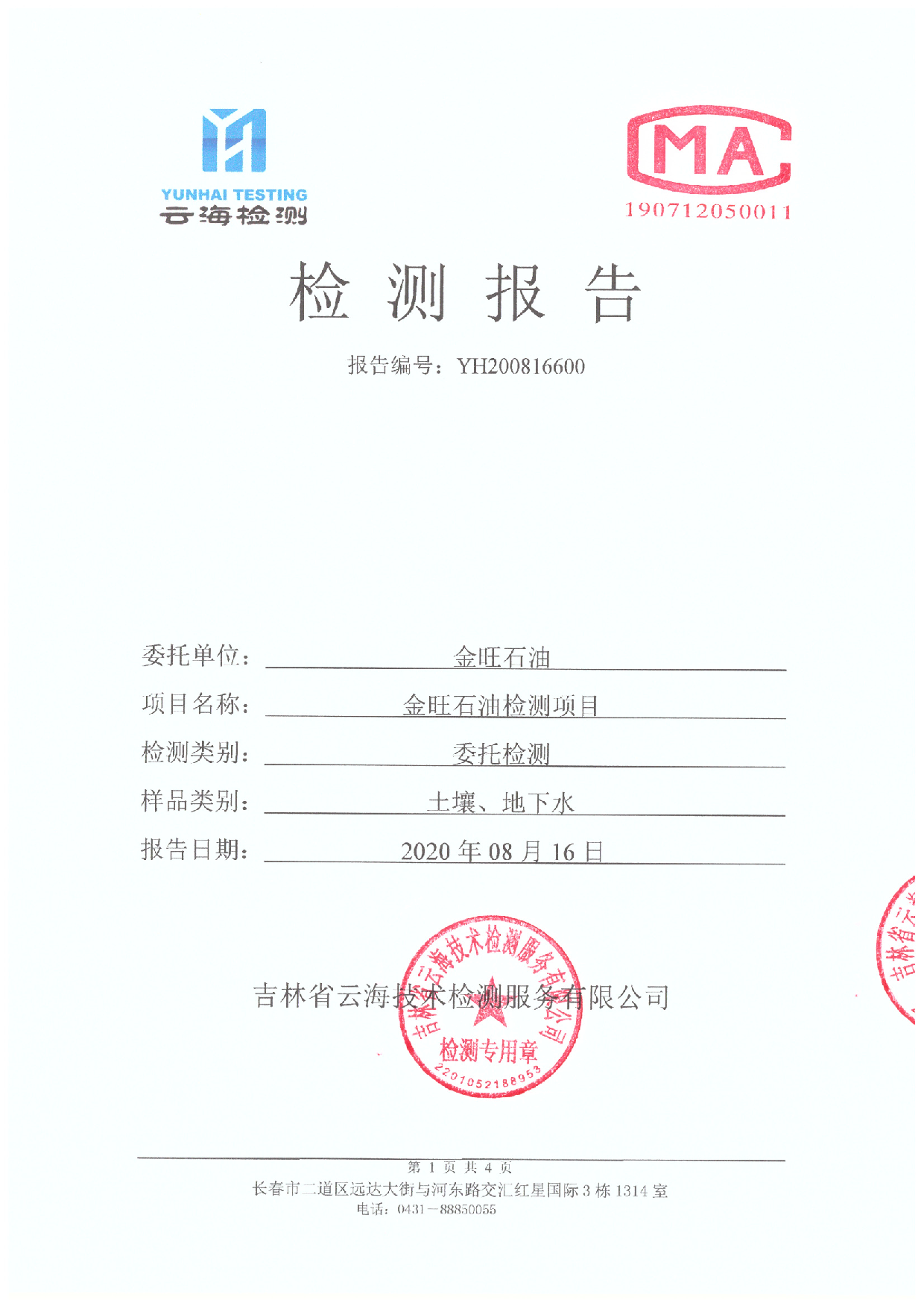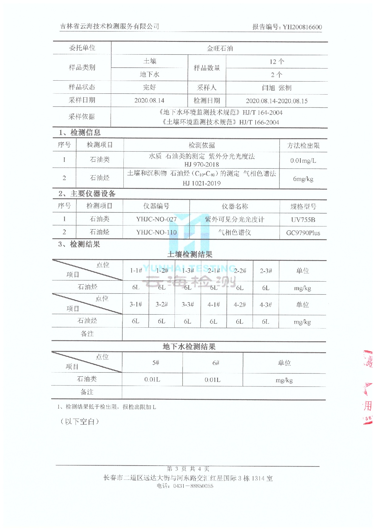 YH200816600 金旺石油檢測項(xiàng)目(土壤、地下水)
